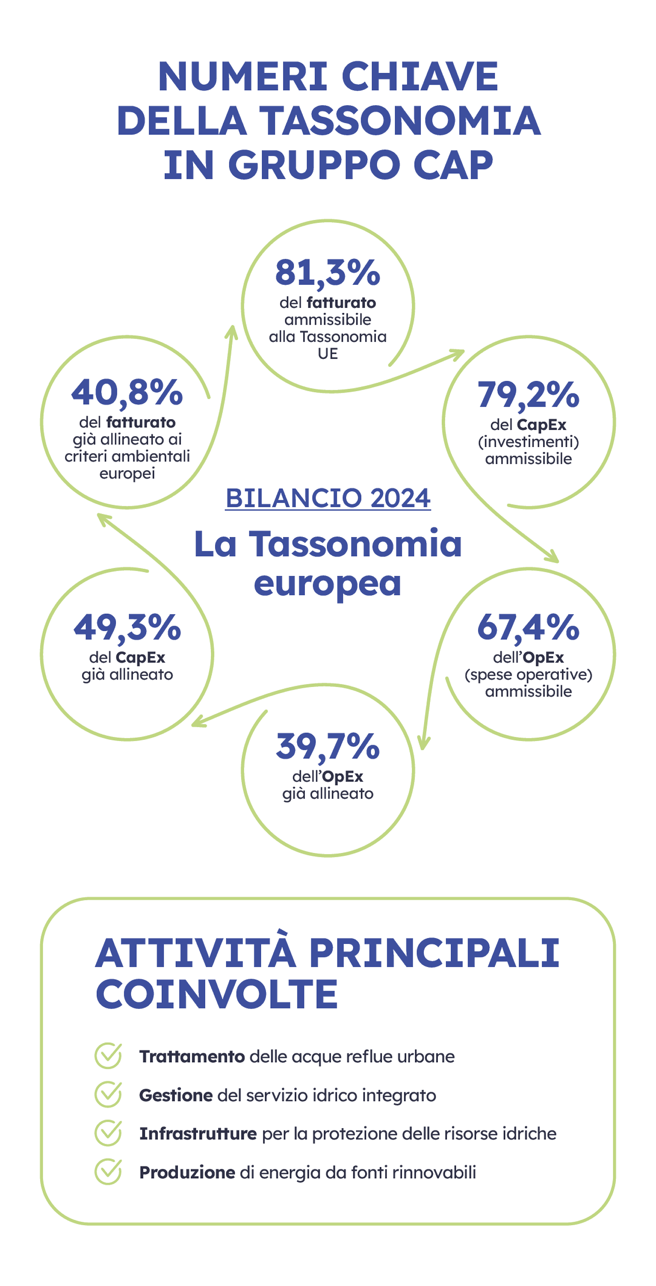 Nel sistema delineato dalla Tassonomia europea, molte delle attività svolte da Gruppo CAP rientrano tra quelle considerate sostenibili.