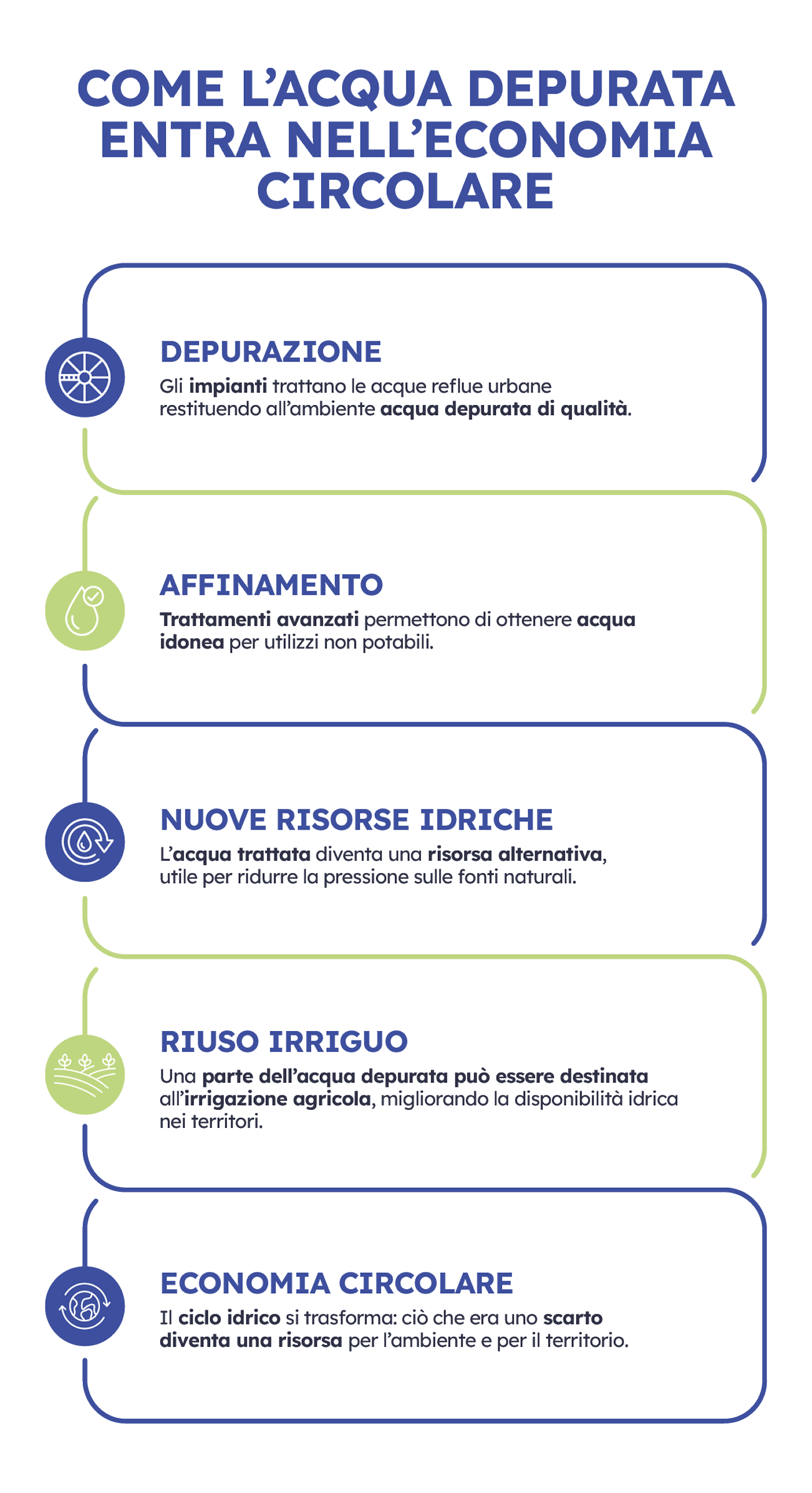 Se l’acqua depurata viene riutilizzata per l’irrigazione agricola, si riduce il prelievo dalle falde o dai corpi idrici naturali. In questo modo l’acqua viene prelevata una sola volta dalla natura ma utilizzata per più scopi, applicando un principio tipico dell’economia circolare.