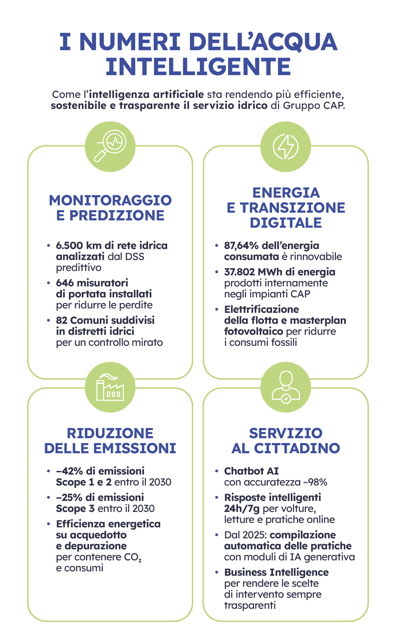 La rivoluzione digitale coinvolge anche il rapporto diretto con le persone. Accanto al DSS, Gruppo CAP ha introdotto un assistente virtuale intelligente basato su IA generativa e tecnologia Microsoft Azure che non si limita a rispondere velocemente a domande frequenti: riduce i tempi di attesa, aiuta nella compilazione delle pratiche e a partire dal 2025 è in grado di guidare gli utenti passo per passo nella presentazione delle richieste online. Con un tasso di precisione vicino al 98%, il chatbot utilizza esclusivamente documenti ufficiali dell’azienda, garantendo informazioni sicure, aggiornate e controllate.